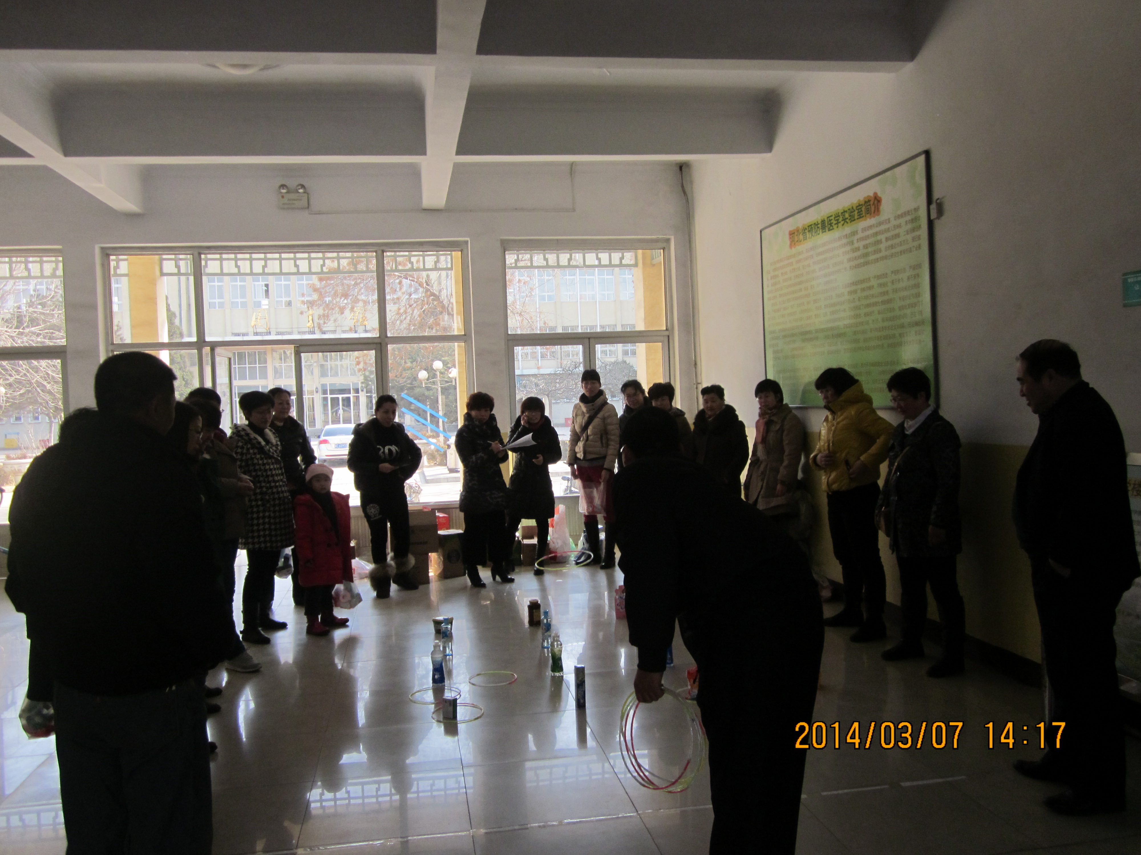 2014年3月7日太阳成tyc122cc在动科楼一楼大厅举办了庆三八趣味套圈活动。本次套圈活动给每个教职工发放套圈的圈10个,站在套圈起止线外套,套中哪排奖品就到领奖处领取哪个等次的奖品,奖品共分为类,第一排的价值最低,难度也最低,离着起止线最近,以此类推最后一排离着起止线最远,奖品价值也最高。男教工在本次活动中参与的积极性也较高,他们的起止线比女教工远了一些,但是命中大奖率还是比较高,大家在套圈的过程中时不时发出开心得笑声,套不住的给予鼓励,套进大奖时大家齐鼓掌庆祝,气氛十分热烈,大家都开开心的度过这个三八节日,每人得到的奖品也非常丰厚,最多的能命中7圈,收获不小。