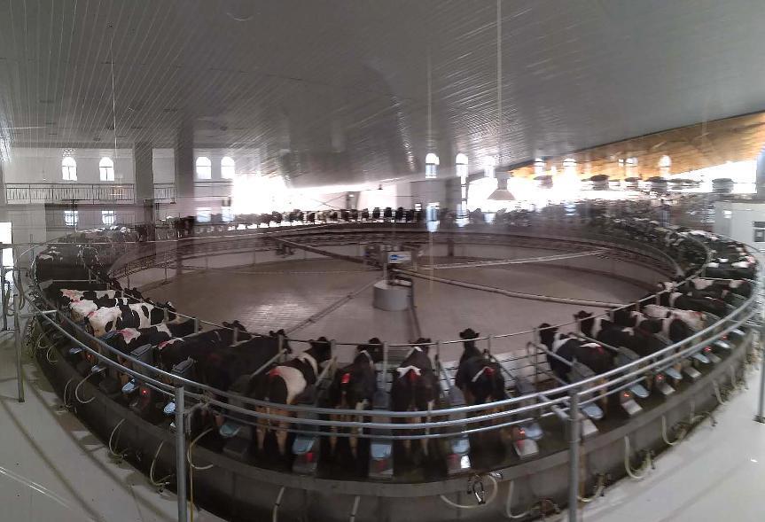 牧场建有全球最大的100位转盘,分别为博美特转盘2座,利拉伐转盘1座,每座每小时可以挤600头牛,可满足10000多头泌乳牛挤奶需求。先进的挤奶设备可自动采集每头牛只产量信息,同时通过电导率进行牛奶监测,指导生产和监控奶牛健康。
